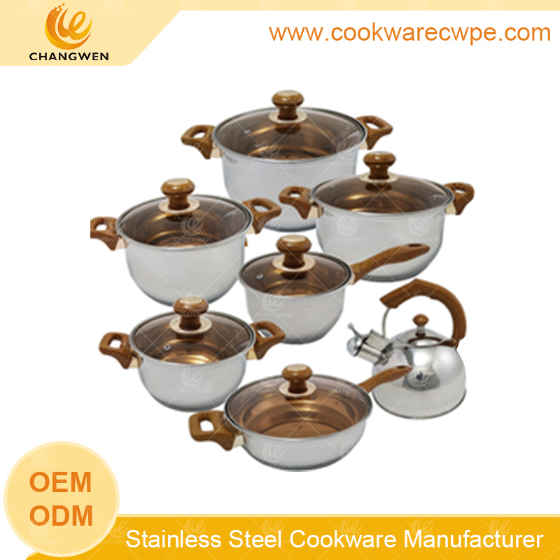 | description | 14 pcs stainless steel Cookware Set Conical shape, rolled and stepped edge, mirror polishing inside and outside, bakelite handle and knob with rivet,gold-plated, C shape brown glass lid, S/S 201 material, 0.5mm body thickness, 0.5mm alu+2.5mm iron+0.5mm alu.capsule bottom, S/S 430 material protector for induction. 2.5L whistling kettle. |